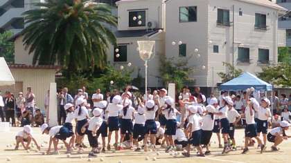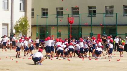 1年生の団体競技は、「令和最初のたまいれ」です。1年生の子どもたちは、夢中で玉をかごに向けて投げ込んでいます。