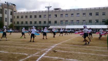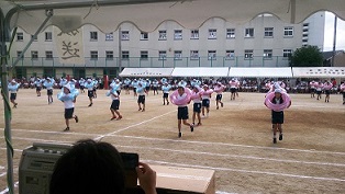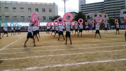 4年生の団体演技は、「Let'sダンス!エブリディ カチューシャ」です。浮き輪をとても上手に操作して、華やかな演技を披露しています。