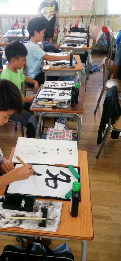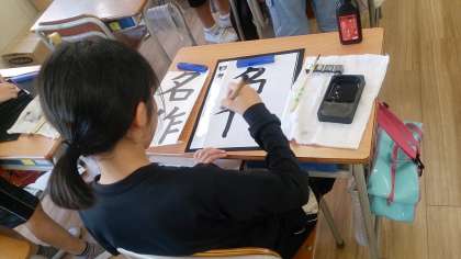 4年生の国語で、書写の毛筆の学習に取り組んでいます。「名作」という字を「はらう」「とめる」に気を付けて書いています。