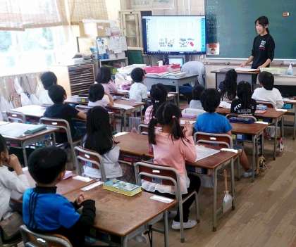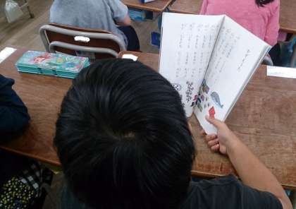 1年生の国語で、詩「かぞえうた」を全員で音読しています。とてもリズミカルに音読ができています。