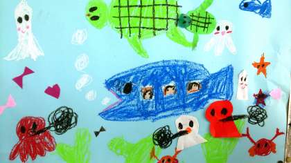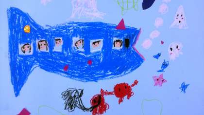 1年生の図工で、「のってみたいないってみたいな」の描画に取り組んでいます。想像を広げて,乗ってみたい乗りものやそれに乗っている自分や周りの様子を形や色などを工夫して表現しています。