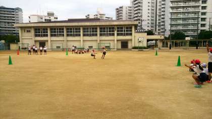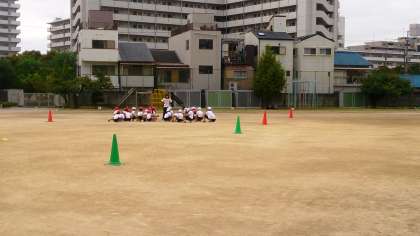 3年生の体育で、「かけっこ・リレー」の学習に取り組んでいます。チーム対抗のリレーでは、チームごとの応援、声援が運動場に響いていました。