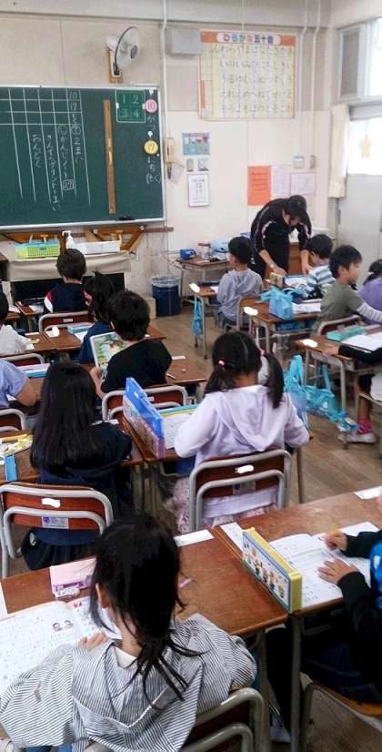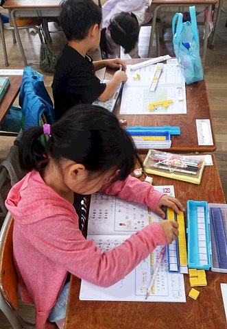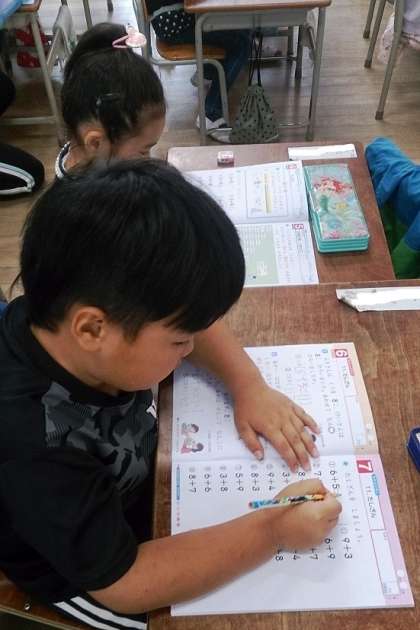 1年生の算数で、「たし算」のドリル学習に取り組んでいます。子どもたちは、集中して問題を解いています。