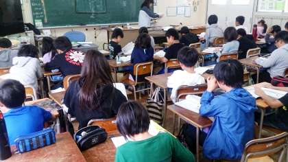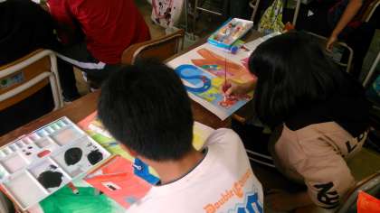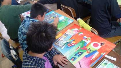 6年生の図工の時間に、名前のイニシャルを図案化した作品を作っています。文字の形や色、デザインを工夫して描画しています。