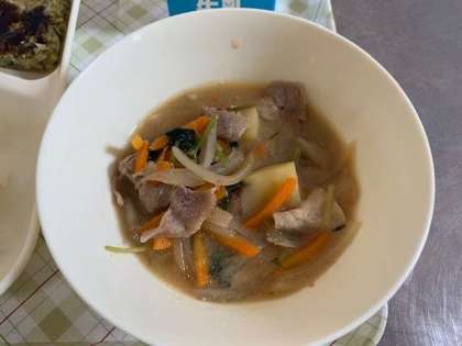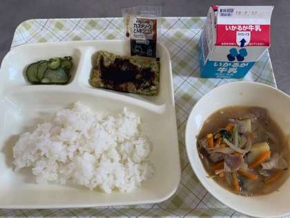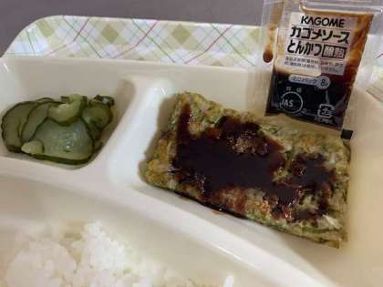 今日の給食は、お好み焼き、豚汁、きゅうりの甘酢あえ、ごはん、牛乳です。