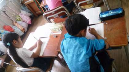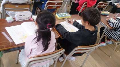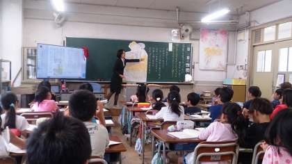 考えたことをワークシート書き込みます。黒板も、視覚的にわかりやすいように、挿絵等を活用しています。