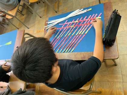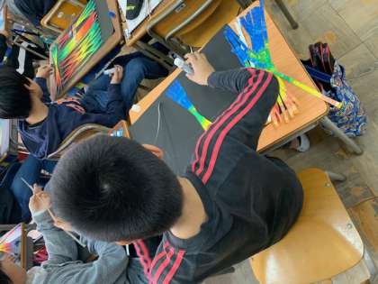 1組もグラデーションに色をぬった紙を重ねたり、交差させたりして作品を創っています。