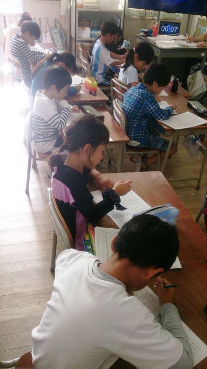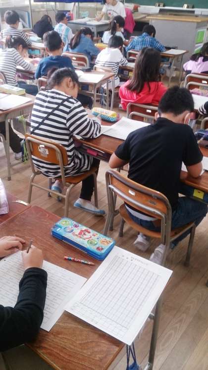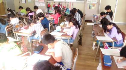 全校で、毎週水曜日の朝の時間に、「算数チャレンジ」に取り組んでいます。決まった時間内に、計算練習をしていきます。写真は、2年生の学習の様子です。