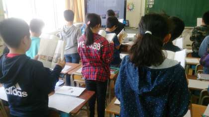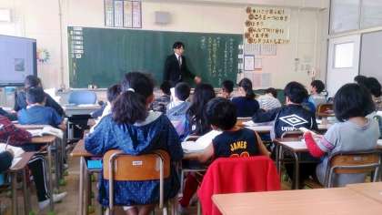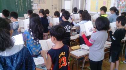 5年生は、国語の研究授業に取り組みました。説明文「和の文化について調べよう」「和の文化を受けつぐー和菓子をさぐる」の学習です。文章の観点を確認し、全員で音読している様子です。