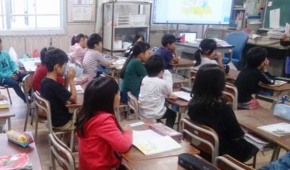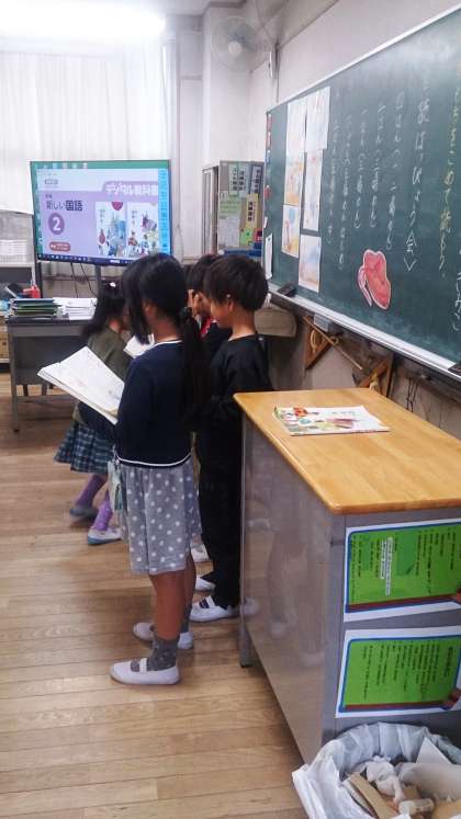 2年生の国語では、音読発表会でグループごとに発表しています。動作も入れて工夫して発表しています。
