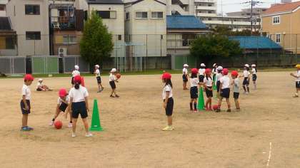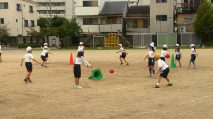 2年生の体育では、ボール投げゲームの運動に取り組んでいます。このゲームは、子どもたちが、的に当てたり、的を倒したりすることで、楽しさを感じることのできる運動です。。