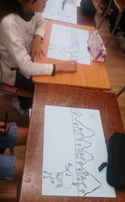 4年生の国語では、物語文「ごんぎつね」を絵で描く学習に取り組んでいます。しっかりと読み込んで作品を創作しています。