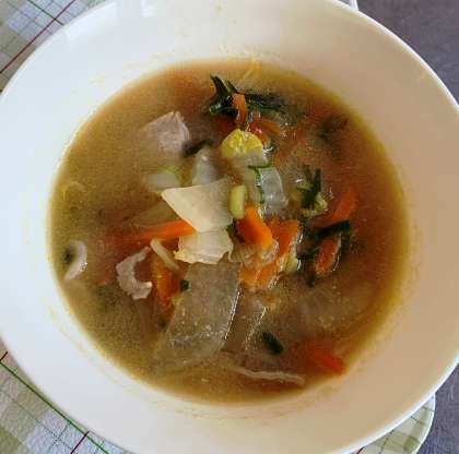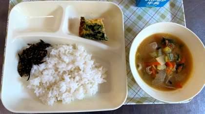 今日の給食は、千草焼き、味噌汁、ごまひじき、ごはん、牛乳です。