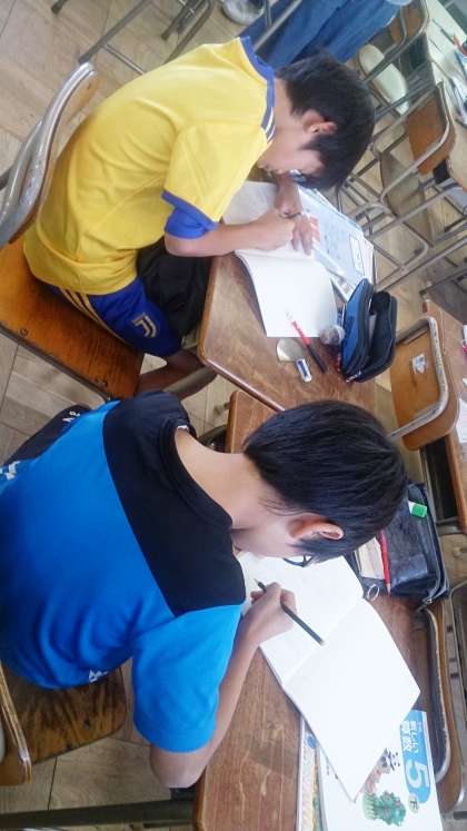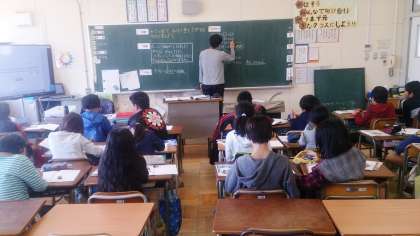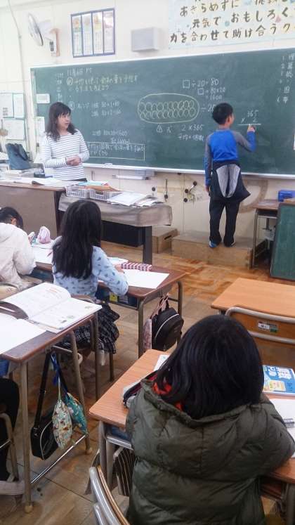 5年生の算数で、平均を使って全体の量を予測する学習に取り組んでいます。この学習では、学年を3分割して、学習しています。
