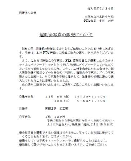 以前配付しました手紙の通り、明後日と日曜参観の時に運動会の写真を販売します。申込袋が改めて配付されますので、写真を選んでもらって、必要なお金を入れて、提出の方していただきますようよろしくお願いいたします。