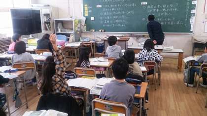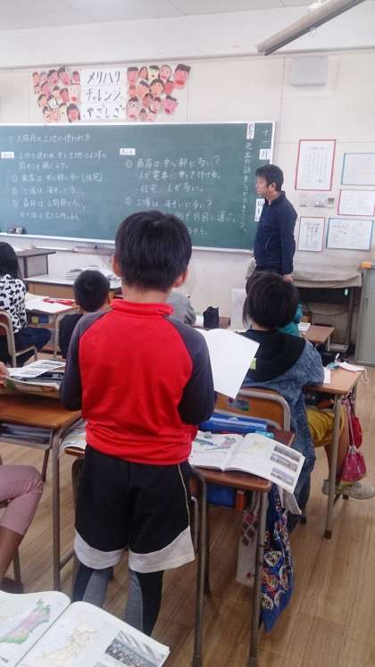 4年生の社会では、大阪府の土地の使われ方についての学習に取り組んでいます。子どもたちは、調べて考えたことを積極的に発表しています。