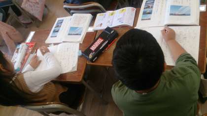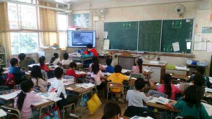 1年生の国語では、説明文「いろいろなふね」の学習に取り組んでいます。デジタル教科書の消防艇などの動画を見て、興味関心を高めています。子どもたちは、とても真剣に画面を見つめています。