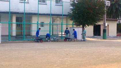 本日より2日間、井高野中学絞の生徒のみなさんが、井高野小学校での職場体験に来ています。朝、全校での自己紹介の後、早速、管理作業員さんの作業に熱心に取り組んでいます。