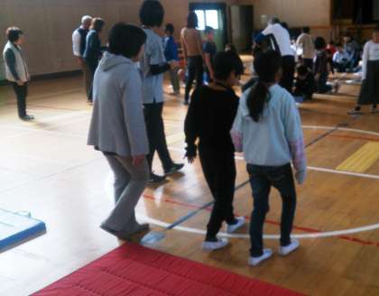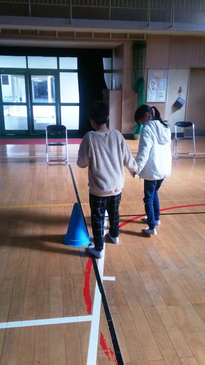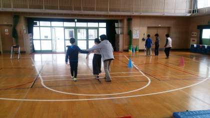 アイマスク体験では、点字ブロックやコーン、マットなどのあるコースを歩き、安全に誘導する方法を体験して学んでいます。