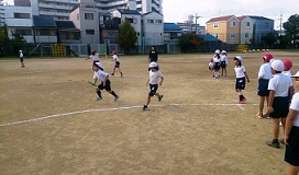 3年生の体育では、かけっこリレーの運動で、走りながらバトンパスをする周回リレーを競走しながら楽しく取り組んでいます。