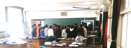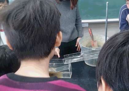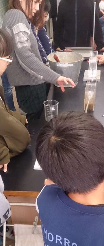 6年生の理科で、「地層」の学習に取り組んでいます。地層堆積モデル実験を観察して、地層のでき方について考えています。