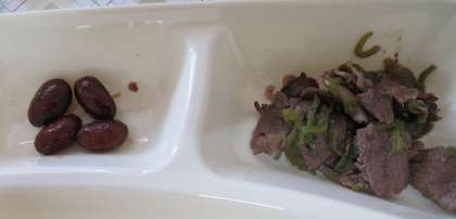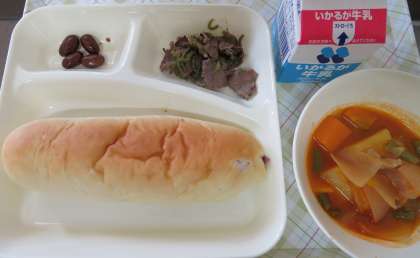 今日の給食は、牛肉の香味焼き、ケチャップ煮、うずら豆のグラッセ、パン、牛乳です。