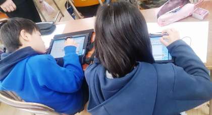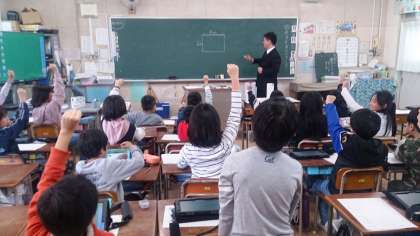 2年生に引き続き、4年生の算数で、研究授業がありました。「面積のはかり方と表し方」の学習です。タブレットの発表シートを活用して、算数的活動に取り組んでいます。