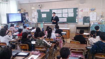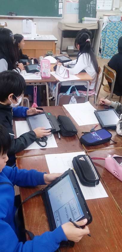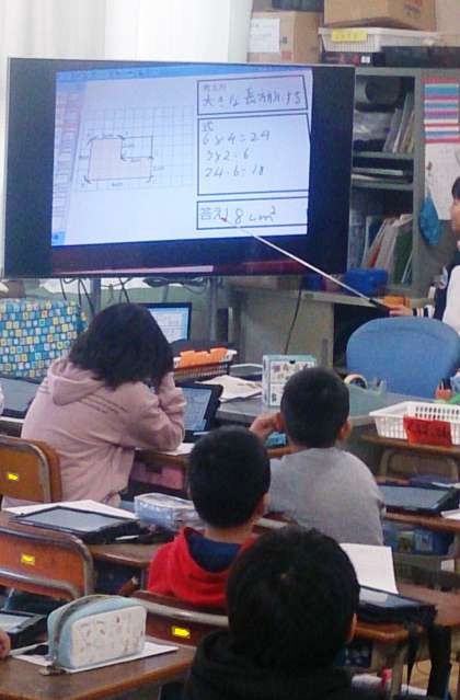 タブレットで課題を考えた後、グループでの話し合い、図形の面積の求め方を発表しました。