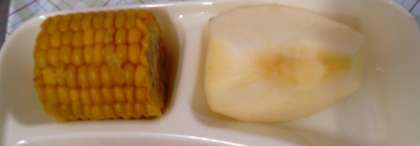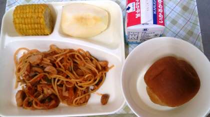 今日の給食は、きのこのスパゲッティ、焼きとうもろこし、りんご、パン、牛乳です。