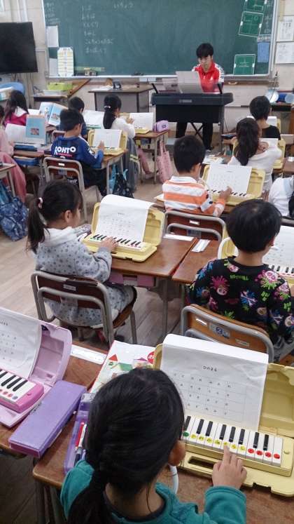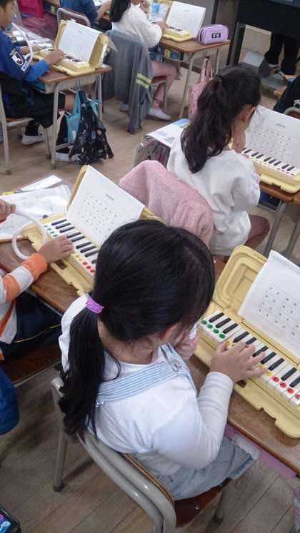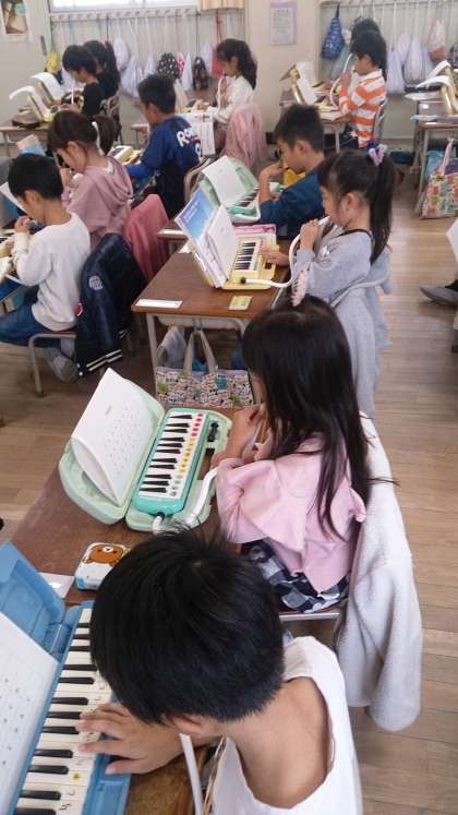 1年生の音楽で、鍵盤ハーモニカの演奏をしています。子どもたちは、楽器の音、伴奏の響きをよく聴いて演奏しています。