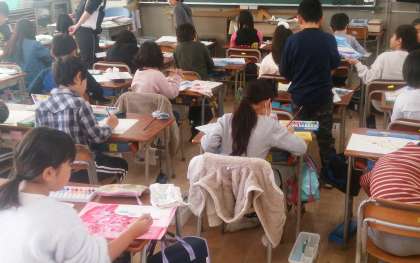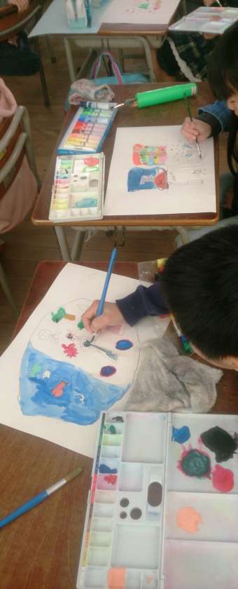 3年生の図工で、「まほうのとびらをあけると」の描画に取り組んでいます。「先生、いい色ができました。」と伝えてくれる子がいました。工夫しながら彩色しています。