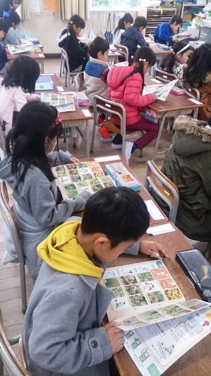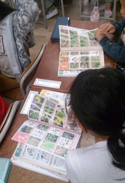 1年生の生活では、秋冬の植物をポケット図鑑で調べています。