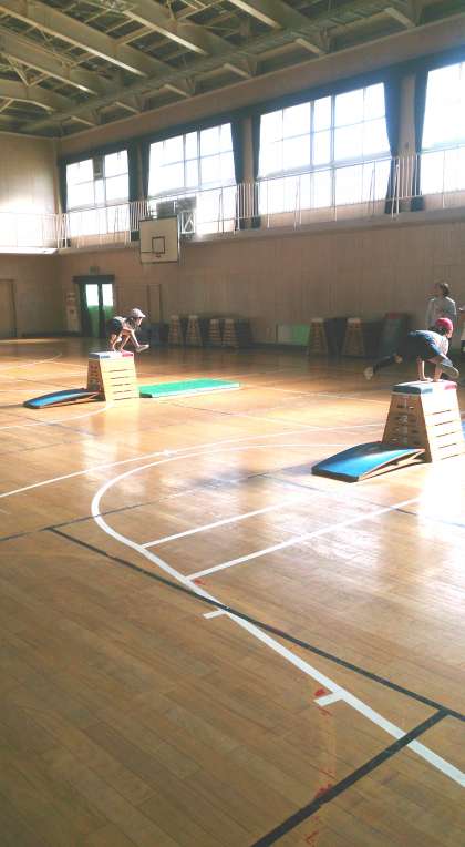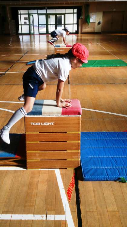2年生の体育で、跳び箱運動に取り組んでいます。子どもたちは、リズミカルに跳んだり、跳び下りて安全に着地したりととても楽しそうです。