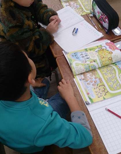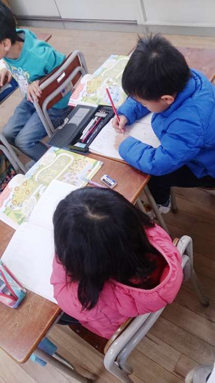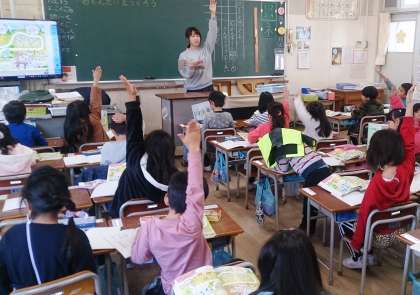 1年生の算数で、「もんだいづくり」の学習に取り組んでいます。たし算やひき算を使って、自分たちで問題を作っていきます。