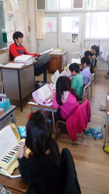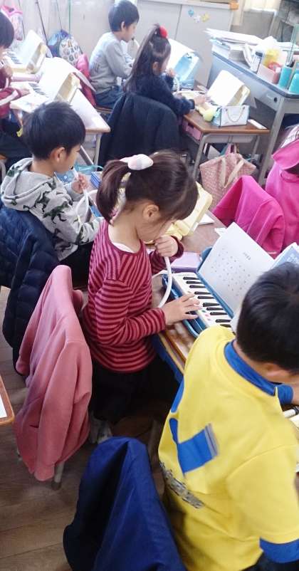 1年生の音楽で、鍵盤ハーモニカの演奏に取り組んでいます。1音1音を指使いに気をつけて演奏しています。