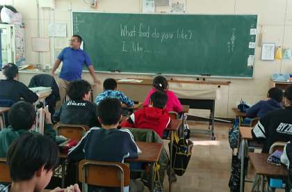 今日はC−NETの先生といっしょに学習しています。好きな食べ物のききかたと答え方を学びました。