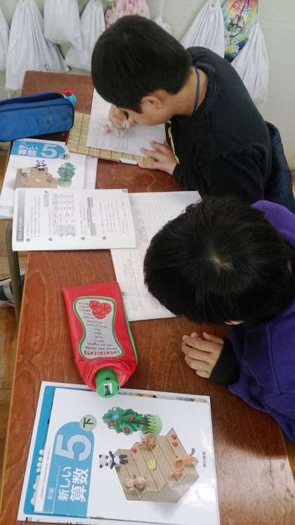 5年生の算数で、しあげの問題に取り組んでいます。学年を3分割して学習しています。