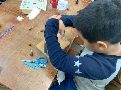 「つくろうあそぼう」の学習で、集めていたどんぐりや落ち葉を使って「こま」や「けん玉」「めいろ」などのおもちゃ作りに励んでいました。