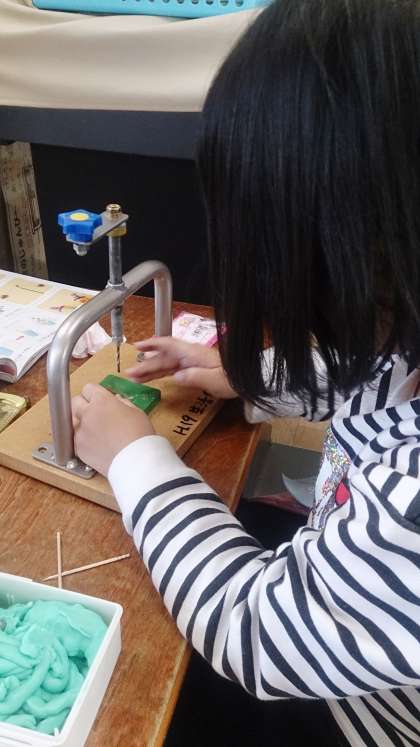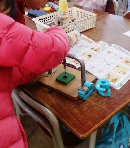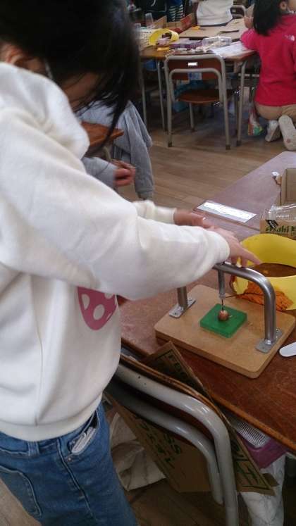 子どもたちは、「どんぐりごま」を作るために、道具を使って軸を入れる穴を開けています。「むずかしい。」とつぶやきながらも、頑張っています。