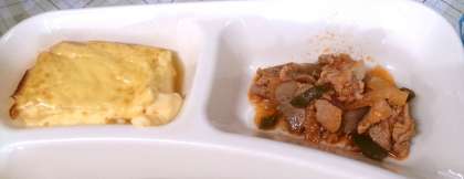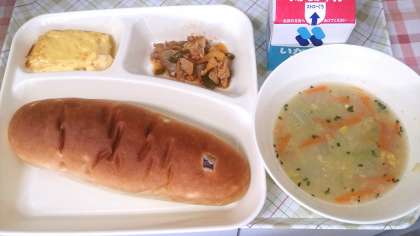 今日の給食は、鶏肉のケチャップソテー、コーンスープ、焼きプリン、パン、牛乳です。
