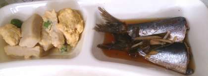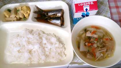 今日の給食は、いわしのしょうが煮、うすくず汁、高野どうふの卵とじ、ごはん、牛乳です。