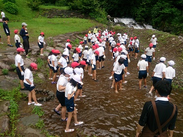 1日目、昼食後に魚つかみをしました。子どもたちは、真剣な表情でニジマスを探しています。