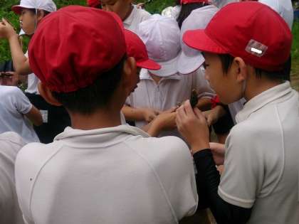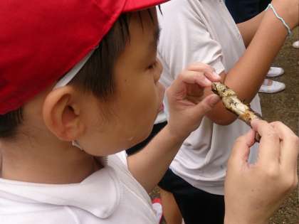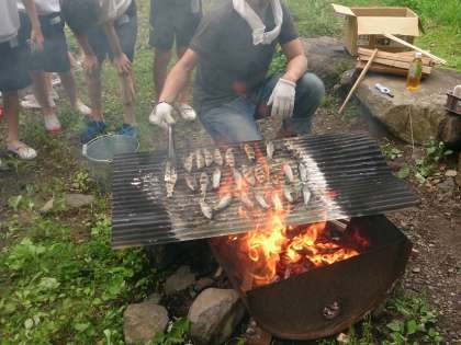 子どもたちは、宿舎の方が焼いている周りに集まり、魚つかみでとったニジマスをみんなでかぶりつきました。