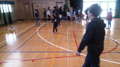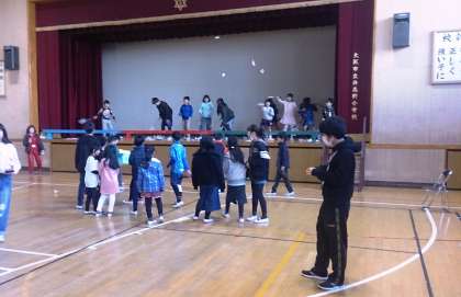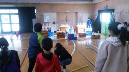 井高野フェスティバルは、講堂や各教室で出店しています。写真は、講堂で出店しているお店で活動する子どもたちの様子です。バトミントンキャッチやキックボーリンク、フルーツ落とし、まと当ての四つのお店が出店しています。