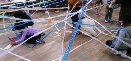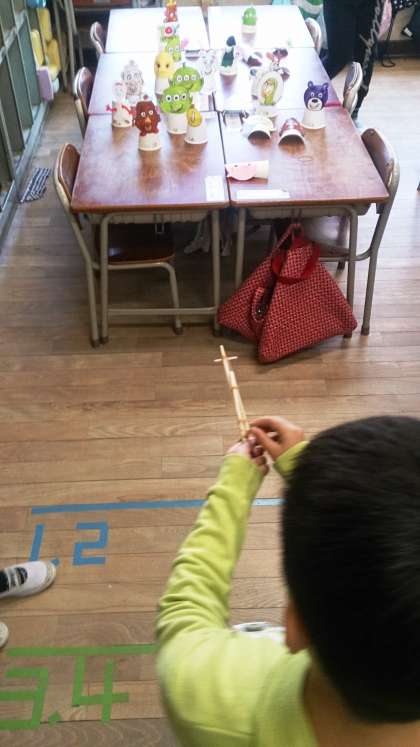 教室でも、工夫をこらしたお店が出店されています。写真は、上からスリッパまとあて、くもの巣、輪ゴムてっぽうです。