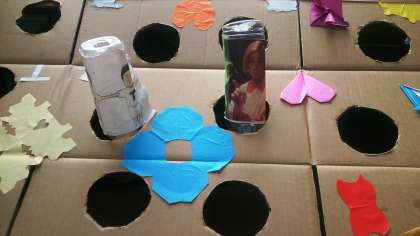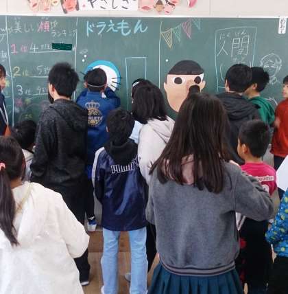 写真は、福笑いともぐらたたきです。ひとつひとつの小道具も、子どもたちの手作りです。