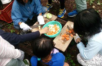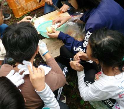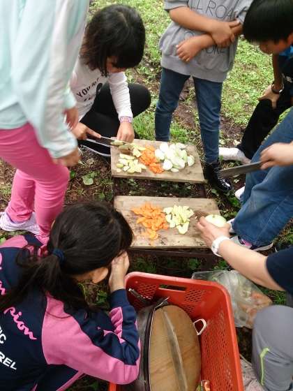 登山の後は、いよいよカレーづくりの開始です。分担を決め協力し合って作っています。
