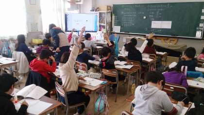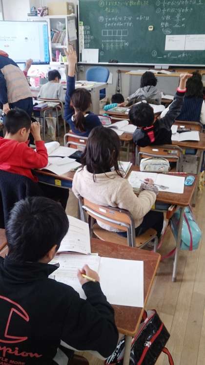 3年生の算数で、1より大きい分数の表し方考えようという課題に取り組んでいます。数直線やテープ図を活用して課題解決していきます。