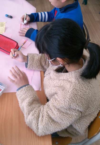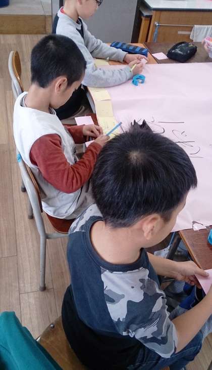 4年生の道徳では、グループでプラスの言葉やマイナスの言葉を話し合っています。相手を幸せにする言葉づかいができるように学んでいます。