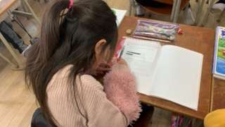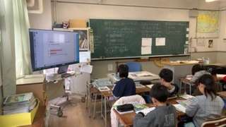 分数の学習で、「4分の3に分けられているテープ図はAとBどちらでしょう?」という問いに取り組んでいました。理由を説明しながら答えることができている児童がたくさんいました。